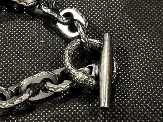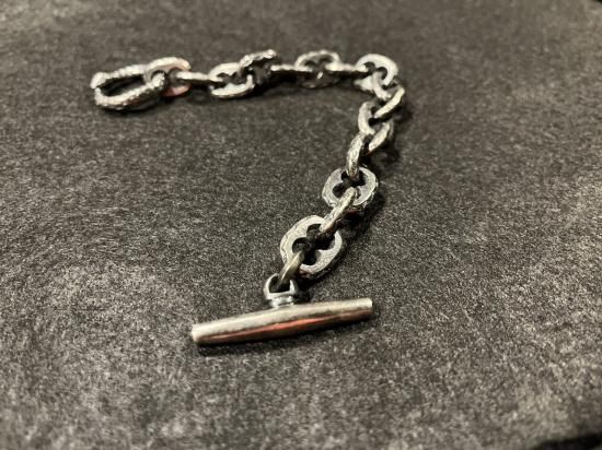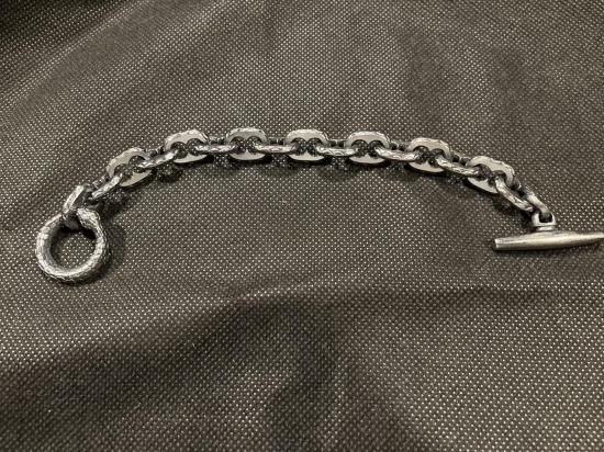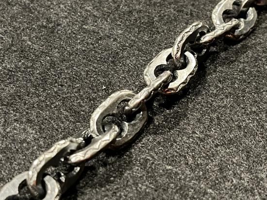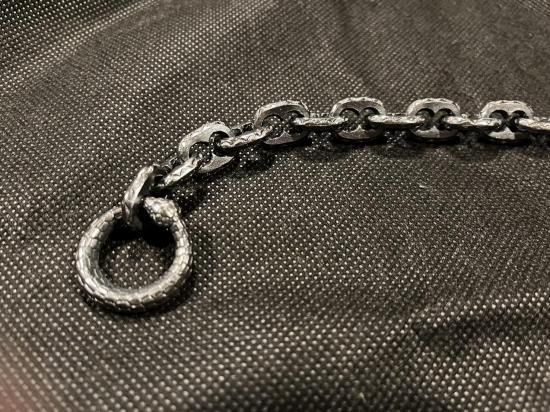 CHAIN…19世紀前半頃のINDIAN JEWELRYのBANGLEをイメージして8ボール形状にアレンジ。当時の特徴の1つでもある「線だけを入れた」STUMP WORKを施している。内側の処理はあえて荒い仕上がりに留め、使い込んで擦れていくうちに良い味が出ます。