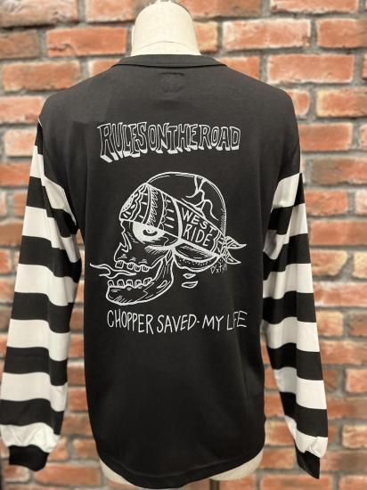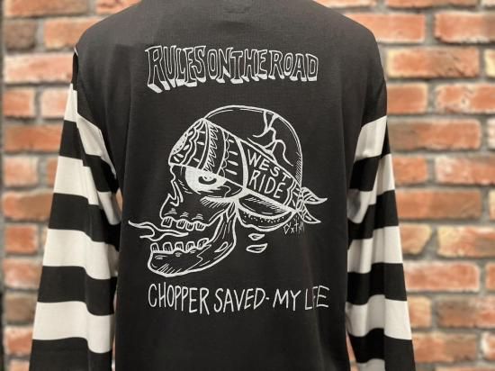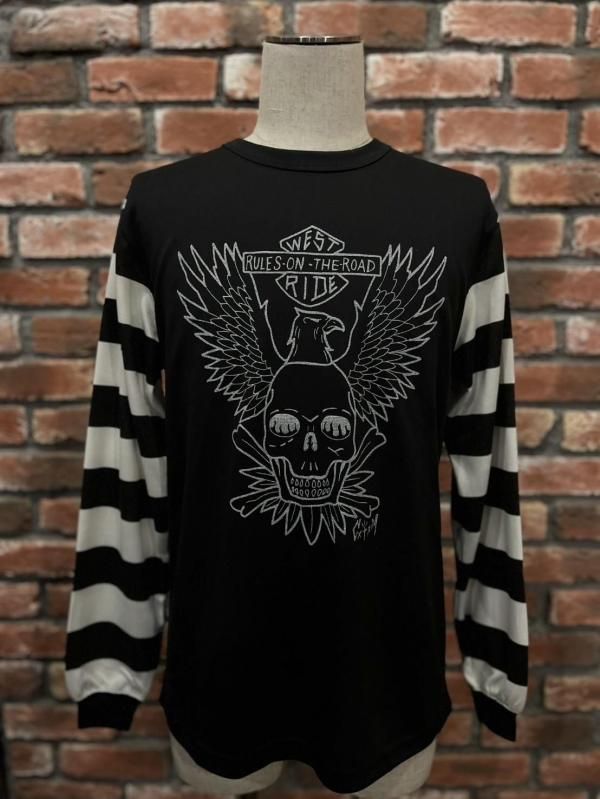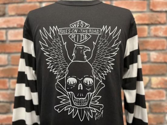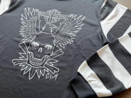 BAR & SHIELDにシーズンテーマを掲げたEAGLEと、背面にはSKULL & BANDANAを配して往年のバイカーテイストを強く打ち出す袖ボーダータイプ。OLD BIKERのイメージと新素材のユニークなマッチングを存分に楽しむことが出来る。