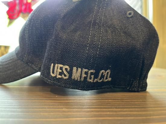 側頭部分の刺繍はチェーン風の糸振りでUESのブランドロゴを入れています。
