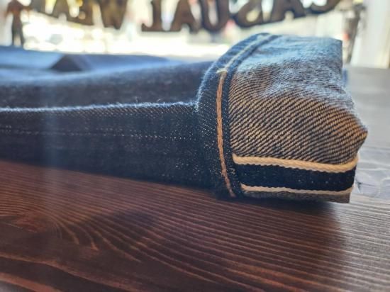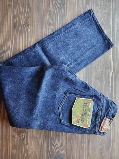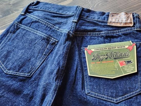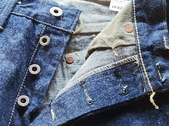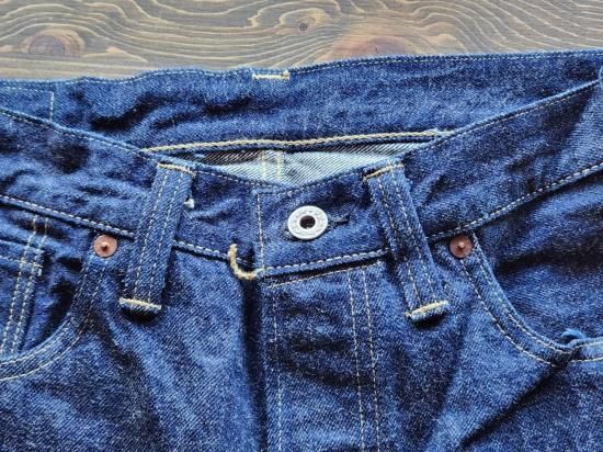 鉄製の唐草柄ドーナツボタン。コインポケットは戦時の物資統制によってリベットが省略されている。熱を与えると縮みが激しいラベルは取り扱いに注意が必要。オリジナルのセルビッジデニムを使用。
