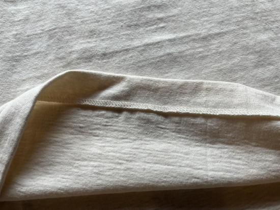 原点回帰でもある「古着」の表情をよりストレート且つ豊かに盛り込んで製作する一枚は16番単糸を吊り編み機でゆっくりと編み上げた丸胴仕上げ。