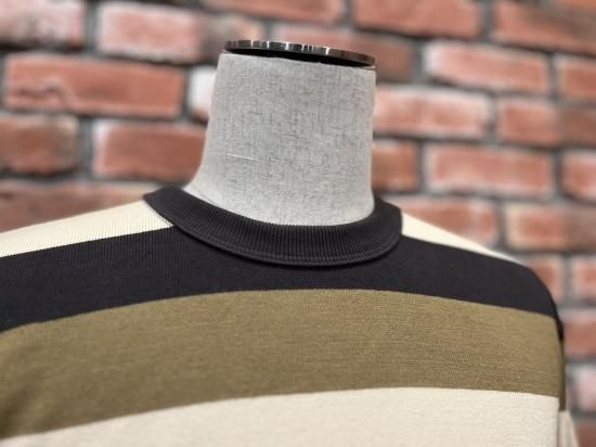 10番糸引き揃えで製作する変則ボーダー。引き揃え手法で生地を編み立てながら、途中で編み方を変更して柄を出していくのには非常に高い技術力が必要とされます。良質な素材と技術力とに裏打ちされた本物ならではの質感に3色ボーダーを取り入れたシンプルで新鮮な新しいボーダーです。