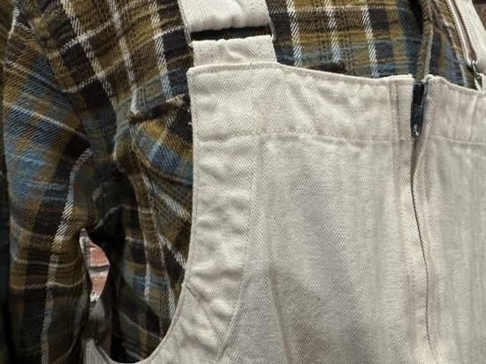 一般的なオーバーオールは、デニム地で肩ストラップを外して脱ぎ着するタイプが多いですが、